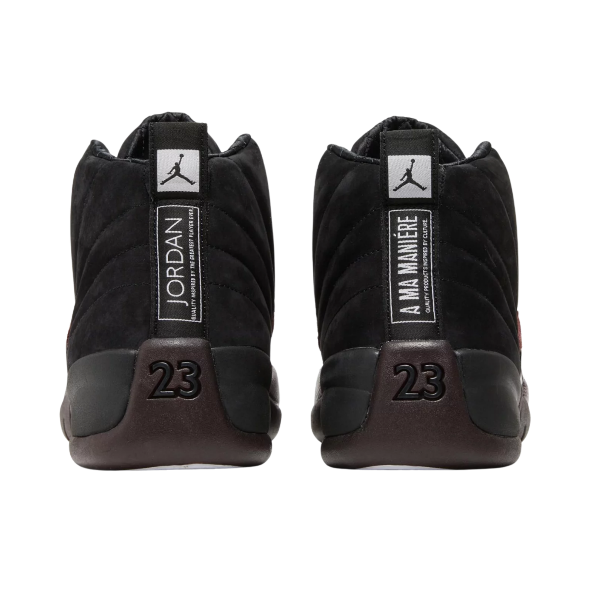 Make a bold statement with the Jordan 12 Retro SP "A Ma Maniere Black" (Women's), a fearless collaboration between A Ma Maniére and Jordan. Premium black nubuck and burgundy suede combine for a luxurious look, and the wax rope laces and branded keychain add a touch of daring. Limited edition, available now!