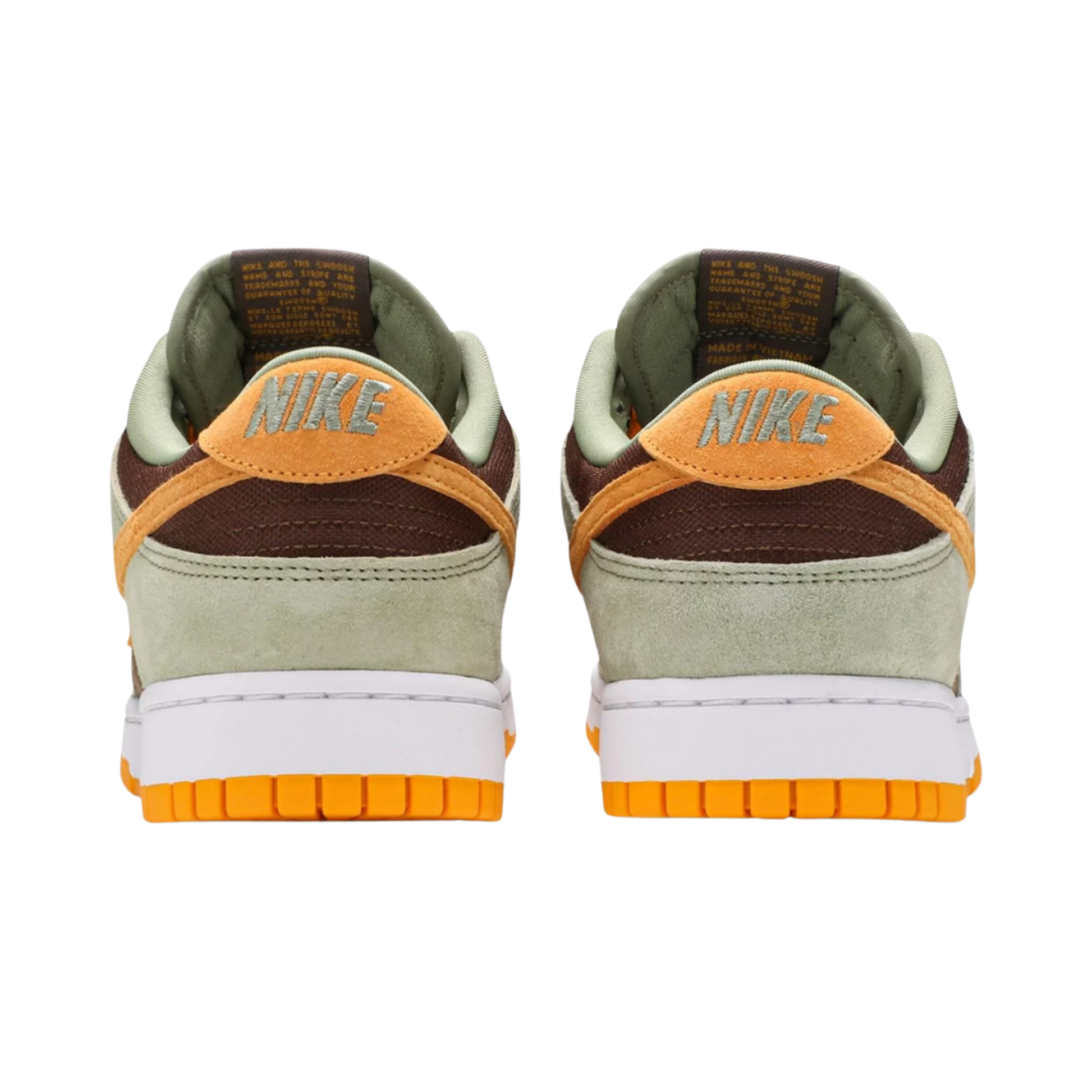 Embrace the thrill of taking risks with the Nike Dunk Low SE "Dusty Olive". The bold combination of Dusty Olive, brown, and Pro Gold suede represents a daring attitude. The brown canvas and embroidered "NIKE" logo add an element of challenge, while the Pro Gold outsole and white midsole signify the reward. Available for $110 in June 2021 and November 2023.